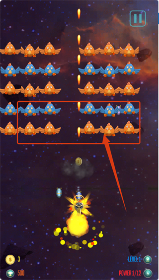 3、瞄準(zhǔn)并射擊雞群,收集金幣和道具,提升飛船的火力和生存能力,推進(jìn)游戲進(jìn)度。
