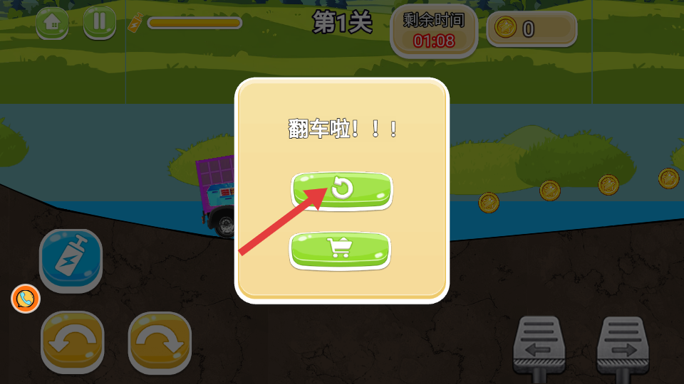 4、若翻車,點(diǎn)擊重置按鈕重新開(kāi)始,總結(jié)經(jīng)驗(yàn),提升駕駛技巧,順利完成關(guān)卡。