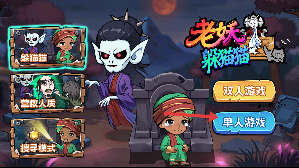 1、點擊【單人游戲】,進入游戲,選擇游戲模式,開啟躲貓貓冒險。