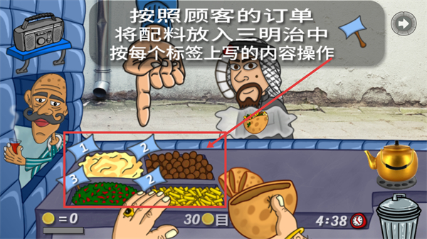 2、按照顧客訂單,將配料放入三明治中,按每個(gè)標(biāo)簽上的內(nèi)容操作。