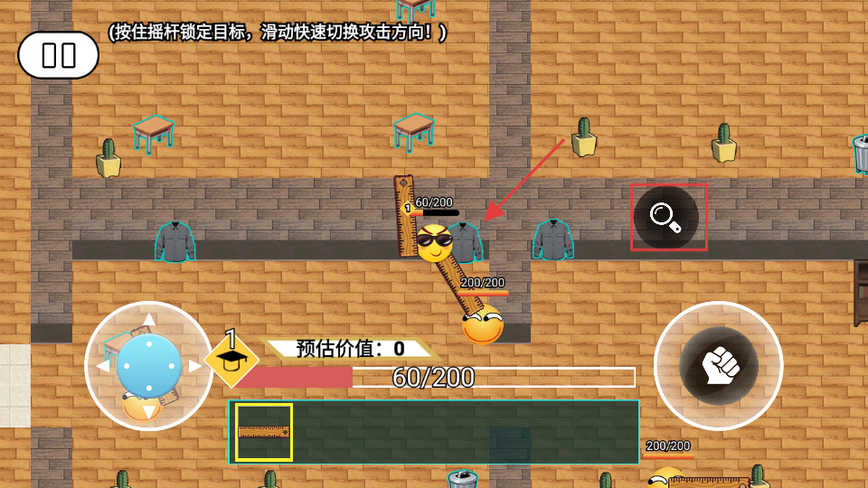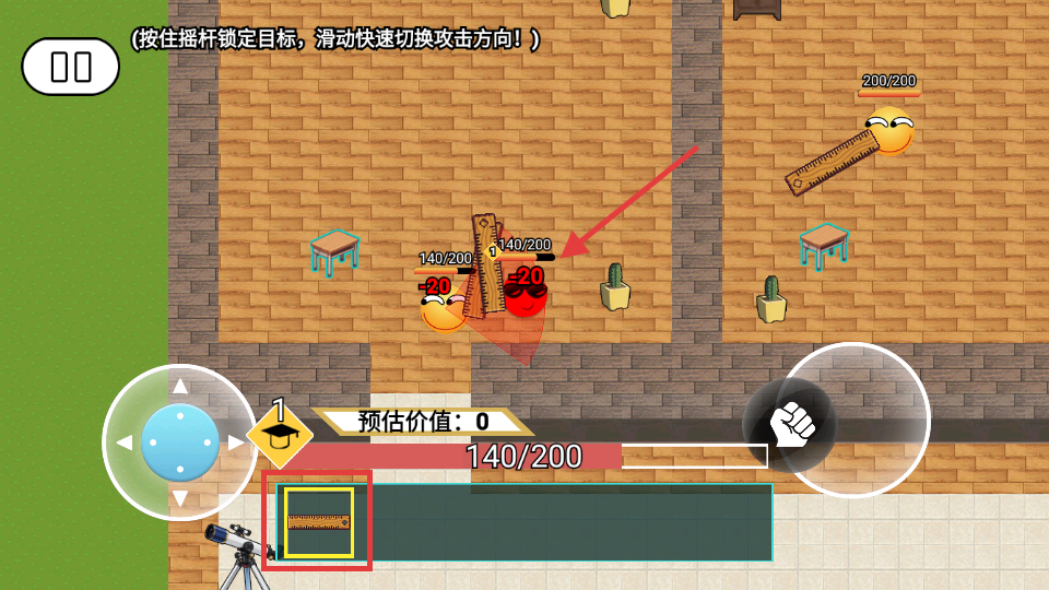 3、按住搖桿鎖定目標,滑動切換攻擊方向,用【尺子】武器攻擊敵人,收集物資提升預(yù)估價值。