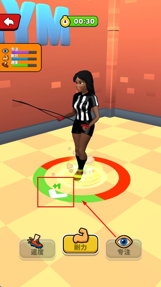 2、跳繩訓(xùn)練時(shí),于綠色區(qū)域跳躍得【+1】,提升【專注】-【耐力】-【速度】,注意【00:30】時(shí)限。