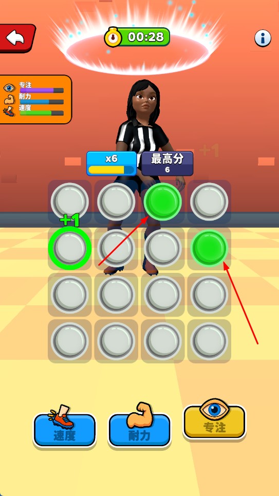 3、點(diǎn)擊訓(xùn)練,點(diǎn)綠色按鈕得【+1】分?jǐn)?shù),同時(shí)不要按在灰色按鈕上關(guān)注時(shí)間。