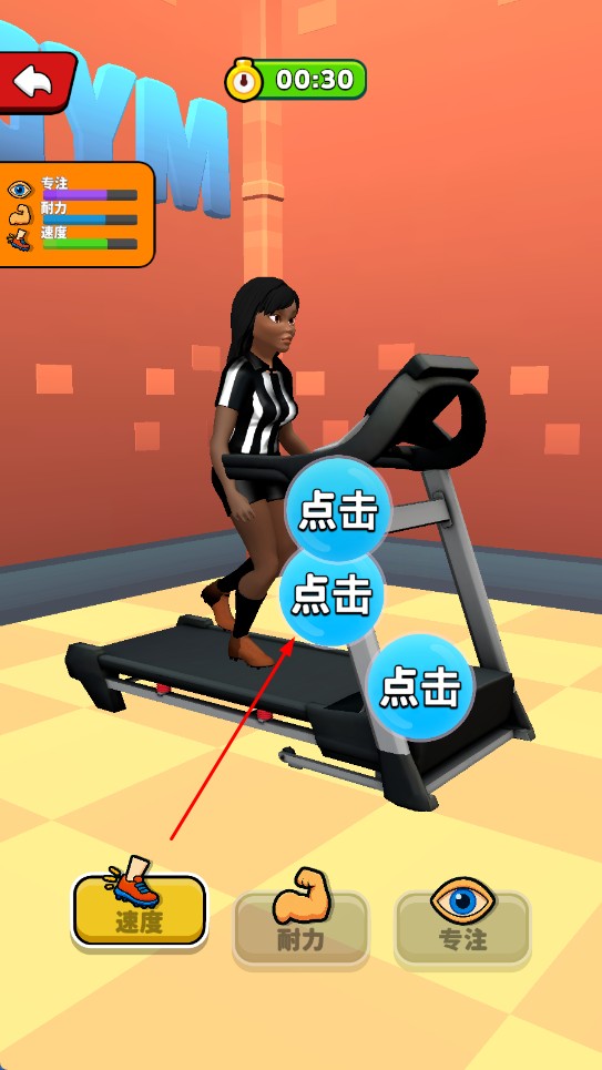4、跑步機(jī)訓(xùn)練時(shí),點(diǎn)擊【點(diǎn)擊】提示,激活【速度】訓(xùn)練獲得分?jǐn)?shù),于【00:30】?jī)?nèi)完成,增強(qiáng)裁判速度。