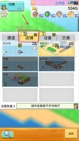 4、點(diǎn)擊【店鋪】選項(xiàng),可建造如飲水處、長(zhǎng)椅、花店等設(shè)施,豐富城市功能以促進(jìn)發(fā)展。