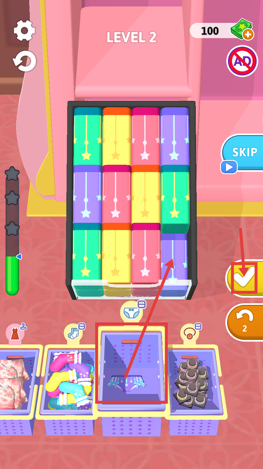 2、整理衣物時(shí),將對(duì)應(yīng)類別衣物放入籃子,完成后點(diǎn)擊黃色對(duì)勾,高效完成衣物分類。