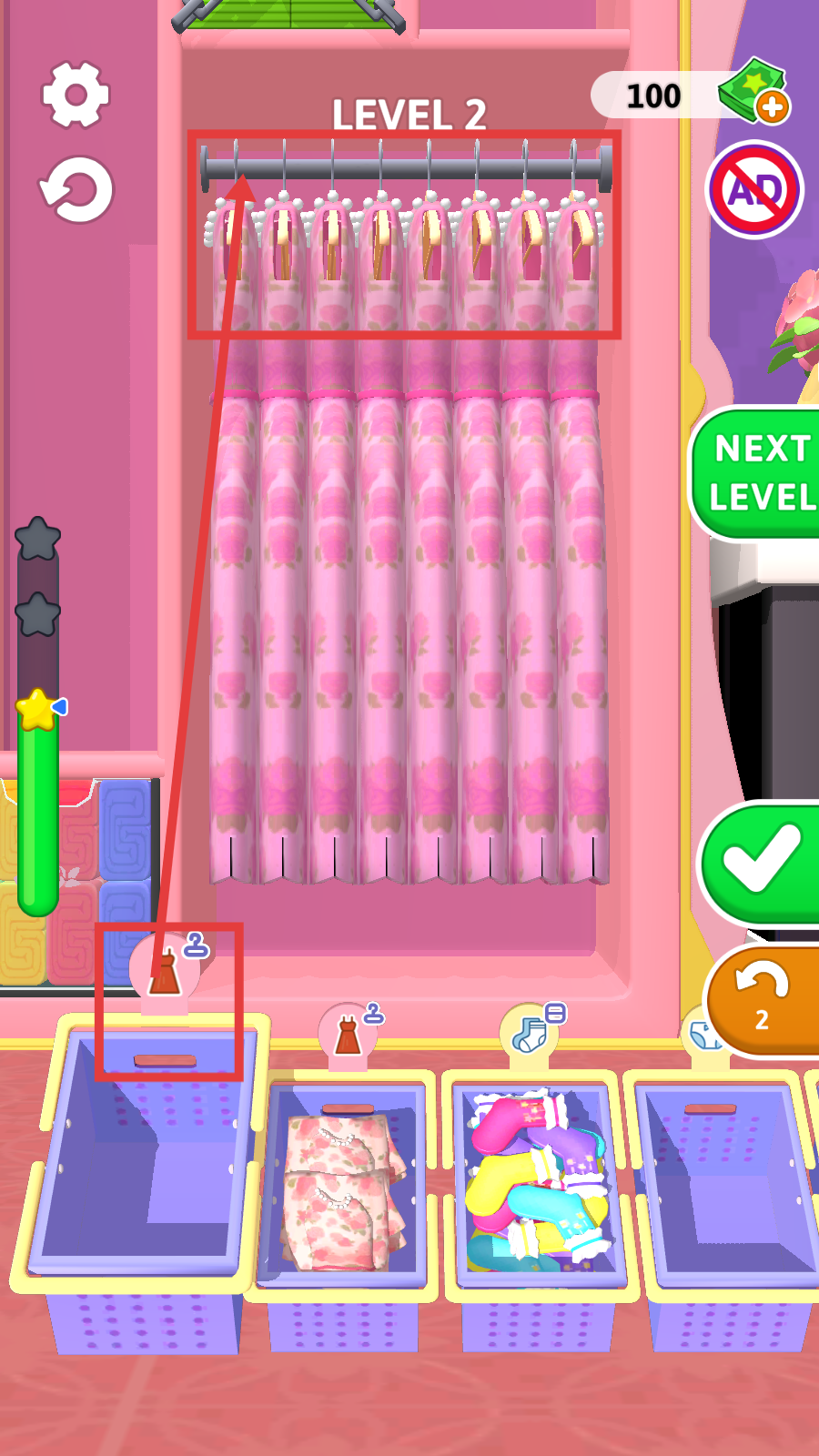 3、將衣物掛到衣柜的衣架上,按類別整理好,完成后可點(diǎn)擊【NEXT-LEVEL】進(jìn)入下一關(guān)。