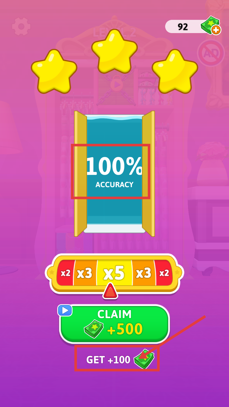 4、通關(guān)后獲得【100%-ACCURACY】評(píng)價(jià),領(lǐng)取【+500】金幣獎(jiǎng)勵(lì),還可額外獲取【+100】金幣,積累資源推進(jìn)游戲。