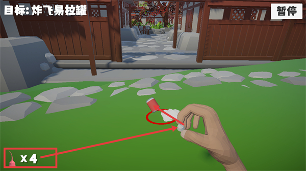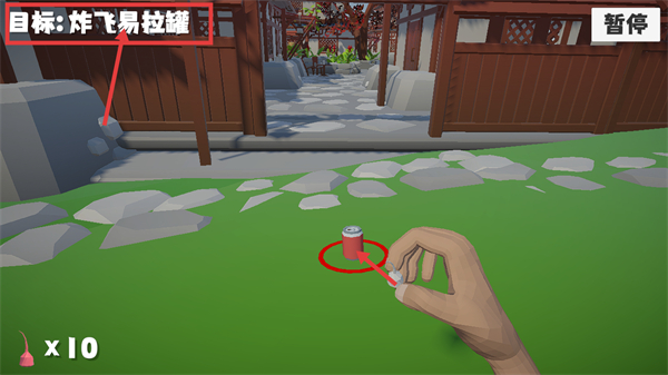 2、明確【目標(biāo)-炸飛易拉罐】,使用鞭炮瞄準(zhǔn)易拉罐,操作點(diǎn)燃鞭炮完成挑戰(zhàn)。