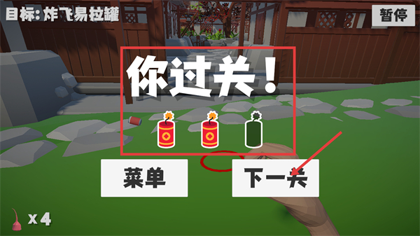 4、通關(guān)后出現(xiàn)【你過關(guān)!】提示,點(diǎn)擊【下一關(guān)】繼續(xù)挑戰(zhàn),解鎖更多鞭炮炸物關(guān)卡。