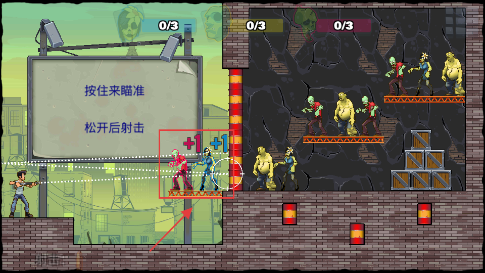 2、按住屏幕瞄準(zhǔn),松開后射擊,優(yōu)先攻擊【+1】標(biāo)識的平臺僵尸,獲取加分并清理目標(biāo)。