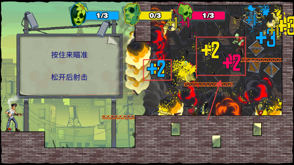 3、借助子彈反彈或爆炸,命中多只僵尸,獲取【+2】等加分,提升關(guān)卡得分效率。