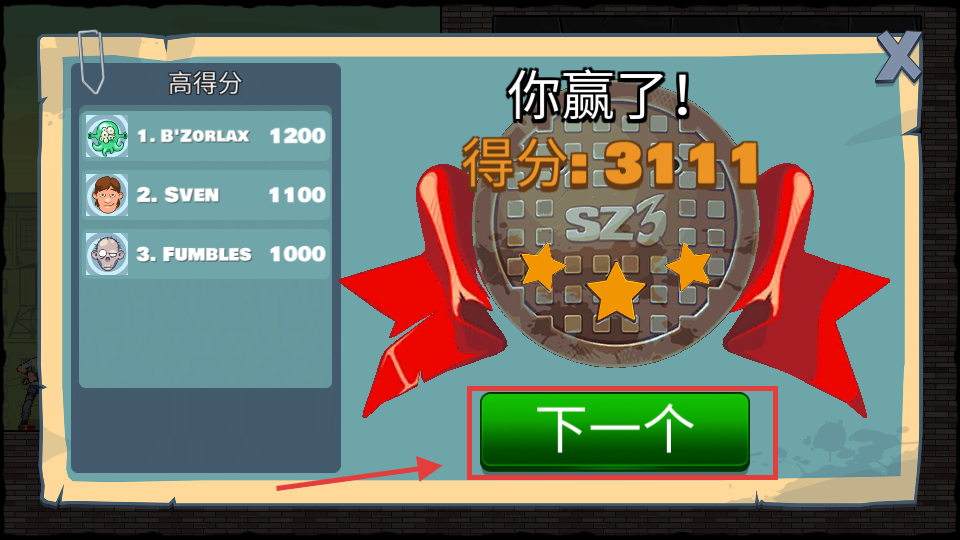 4、關(guān)卡勝利后,點(diǎn)擊【下一個】按鈕,進(jìn)入下一關(guān)繼續(xù)挑戰(zhàn),沖擊更高得分與三星評價。