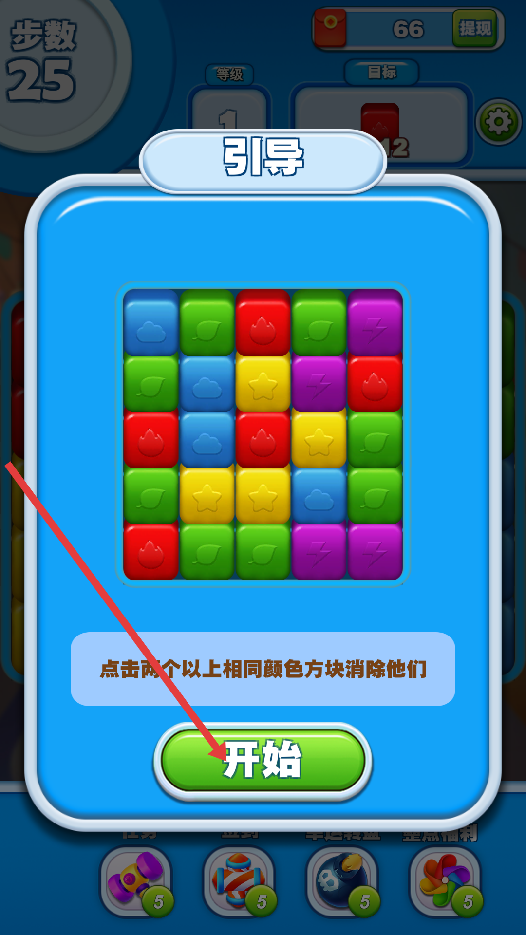 1、在消除類游戲引導(dǎo)界面,點(diǎn)擊【開始】按鈕,進(jìn)入游戲關(guān)卡。