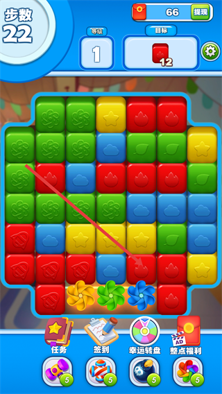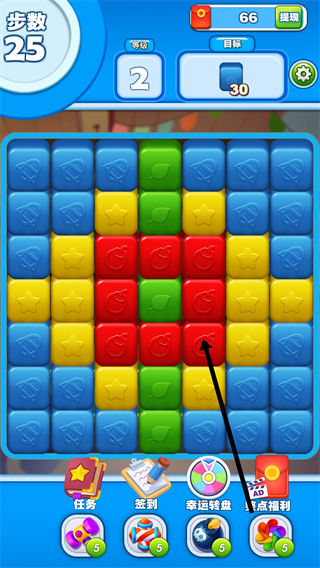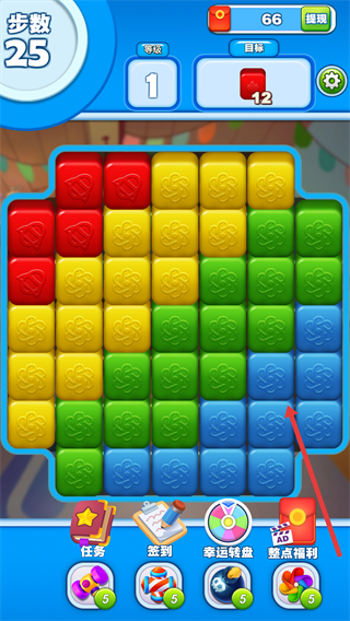 4、完成當(dāng)前關(guān)卡目標(biāo)后,將自動(dòng)進(jìn)入下一個(gè)關(guān)卡,繼續(xù)消除相應(yīng)目標(biāo)方塊以推進(jìn)游戲進(jìn)程。