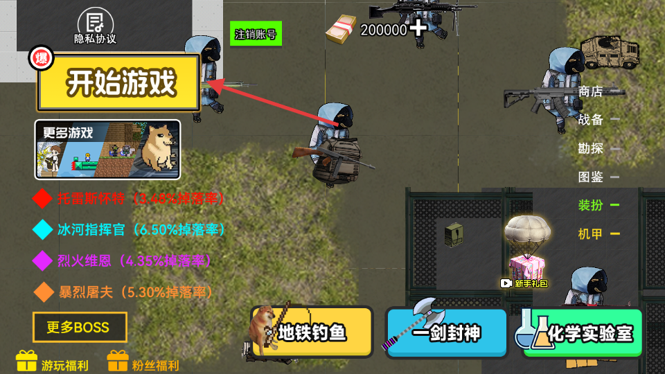 1、點(diǎn)擊【開始游戲】進(jìn)入游玩,可先通過【商店】-【戰(zhàn)備】獲取初始資源,為后續(xù)冒險做好裝備準(zhǔn)備。