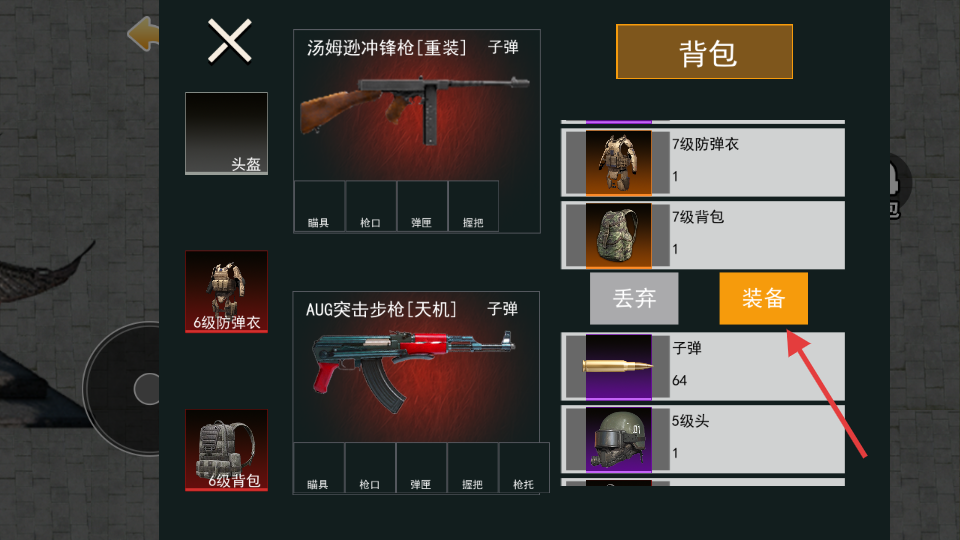 4、在背包界面選擇【6級防彈衣】或【AUG突擊步槍-天機(jī)】,點(diǎn)擊【裝備】按鈕提升角色戰(zhàn)斗屬性。