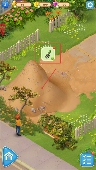 2、獲取場景中的【園藝叉】道具后,使用它處理沙土區(qū)域,清理該區(qū)域的障礙物,推進場景整理的進度。