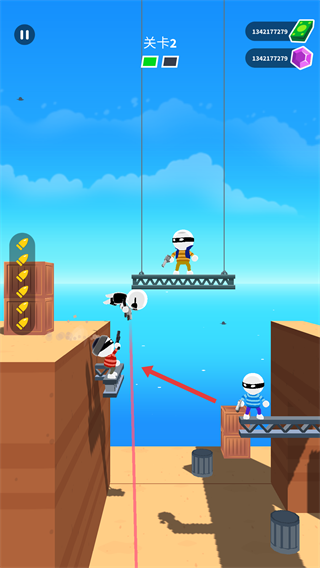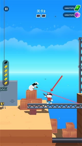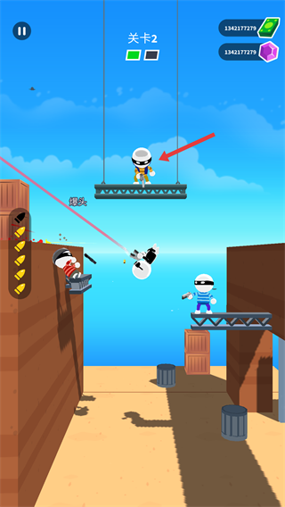 1、在戰(zhàn)斗時,待槍支射線對準敵人后點擊屏幕發(fā)射,精準打擊敵人,推進關(guān)卡進程。