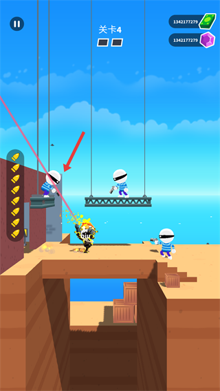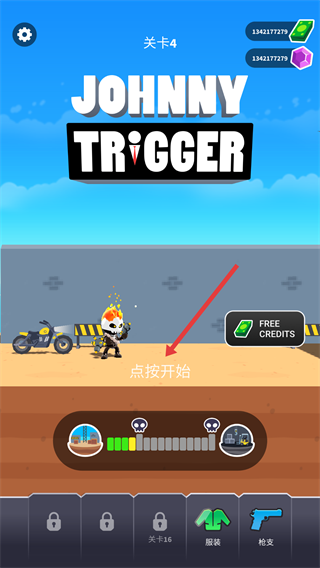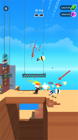 1、進(jìn)入關(guān)卡4,點(diǎn)擊屏幕開(kāi)啟槍戰(zhàn)征程,先好好熟悉角色移動(dòng)和射擊的節(jié)奏哦。
