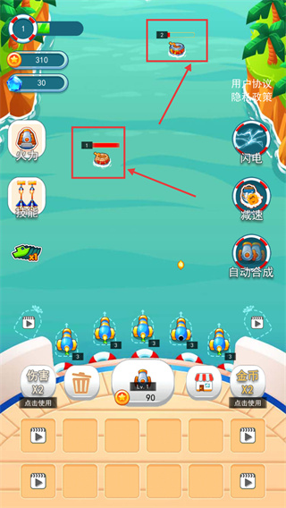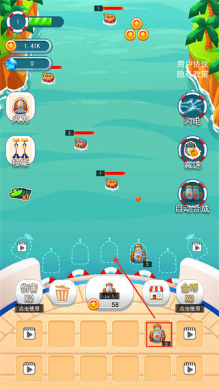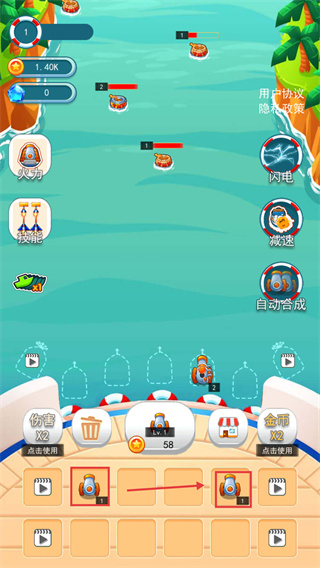 3、所有炮臺均可通過合成持續(xù)升級強(qiáng)化,輔助系統(tǒng)功能實(shí)用且多樣,助力玩家高效抵御海盜及機(jī)甲等強(qiáng)敵,成功守護(hù)領(lǐng)土安全。