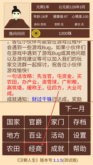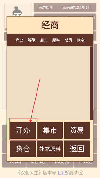 1、進(jìn)入界面可查看到【元朔1年】-【公元前128年3月】等信息,當(dāng)前身份為【百姓】、持有【1200銖】,按指引點(diǎn)擊【經(jīng)商】按鈕開啟對(duì)應(yīng)玩法。