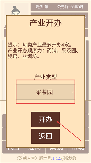 3、進(jìn)入【產(chǎn)業(yè)開辦】界面,須知每類產(chǎn)業(yè)最多開辦【4家】,按順序選定【采茶園】后,點(diǎn)擊界面內(nèi)的【開辦】按鈕推進(jìn)操作。