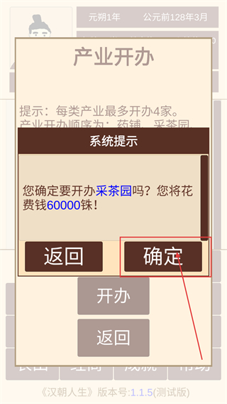 4、彈出【系統(tǒng)提示】確認(rèn)是否開辦【采茶園】,該操作將花費(fèi)【60000銖】,確認(rèn)需求后點(diǎn)擊【確定】按鈕完成開辦。