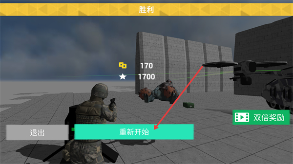 4、關(guān)卡勝利后,可選擇“重新開始”再次挑戰(zhàn)、“退出”返回界面,或觀看廣告獲取“雙倍獎勵”,進(jìn)一步積累游戲資源。