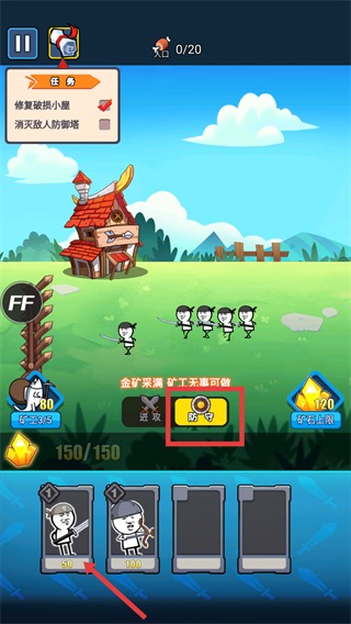 2、先完成【修復(fù)破損小屋】任務(wù),借助【礦工】采集的礦石,消耗50資源召喚步兵,同時點擊【防守】穩(wěn)固當前陣地。