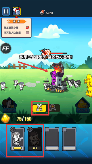 3、擊潰敵軍后,趁熱打鐵召喚更多士兵,并點擊【進攻】摧毀敵方基地。