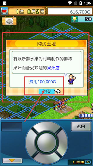 3、進(jìn)入【購(gòu)買(mǎi)土地】界面,確認(rèn)土地關(guān)聯(lián)的【果汁店】信息后,消耗【100,000G】點(diǎn)擊【購(gòu)買(mǎi)】按鈕完成土地獲取。