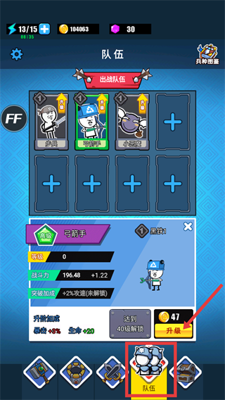 1、進(jìn)入隊(duì)伍界面后,優(yōu)先升級(jí)【弓箭手】,升級(jí)后能獲得加成,助力后續(xù)戰(zhàn)斗哦。