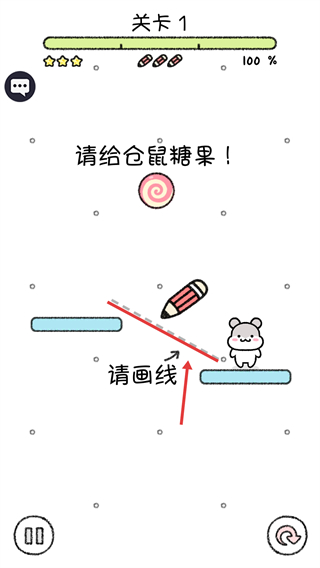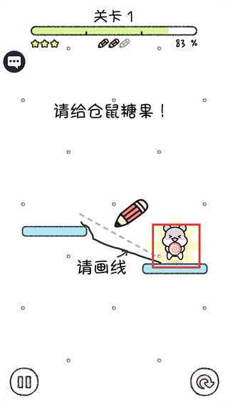 2、進入【關卡-1】后,按照提示的【請畫線】操作,繪制線條引導糖果移動,完成【請給倉鼠糖果】的任務。