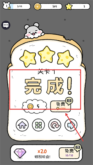 4、關卡完成后,可獲得【金幣-5】等獎勵,點擊箭頭按鈕進入下一關,或選擇其他功能按鈕進行后續(xù)操作。