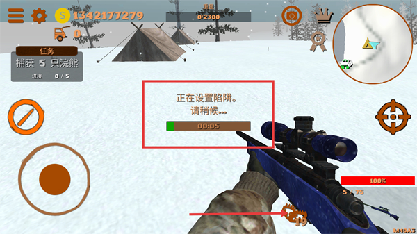 2、在雪地尋找獵物的蹤跡,也可設(shè)置隨身攜帶的捕獸陷阱等,點(diǎn)擊【捕獸夾】等待加載完成即可部署陷阱。