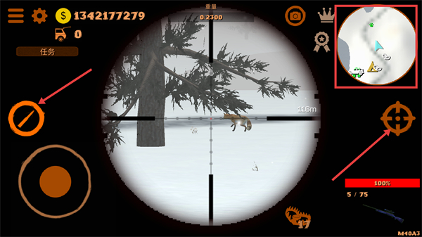 3、發(fā)現(xiàn)獵物,打開(kāi)瞄準(zhǔn)界面后,留意目標(biāo)距離【116m】,配合左側(cè)功能鍵與右側(cè)瞄準(zhǔn)鍵,精準(zhǔn)鎖定獵物。