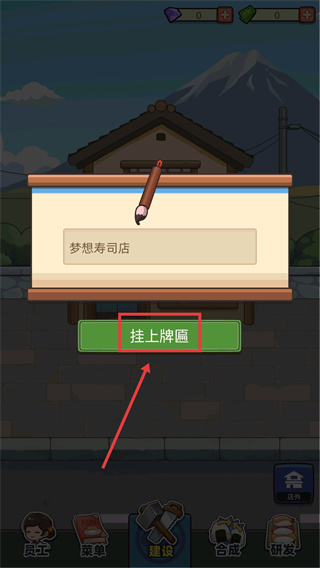 1、在【夢想壽司店】店外界面,點擊【掛上牌匾】按鈕完成店鋪招牌布置,解鎖店鋪運營的初始步驟。