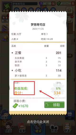 4、查看訂單結(jié)算界面,利用【收益加成-6%】提升收益,點擊【領(lǐng)取】按鈕獲取本次訂單的金幣與小費。