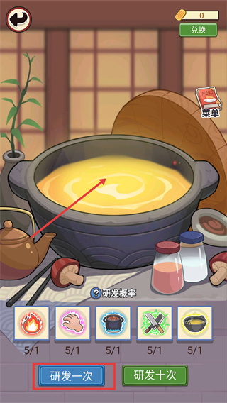 1、在研發(fā)界面,消耗【5/1】類材料點(diǎn)擊【研發(fā)一次】,嘗試解鎖新菜品,提升店鋪餐食種類豐富度。