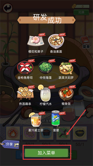2、研發(fā)成功后,點(diǎn)擊【加入菜單】按鈕,將新菜品(如櫻花和果子)添加至可供應(yīng)列表,拓展?fàn)I業(yè)項(xiàng)目。