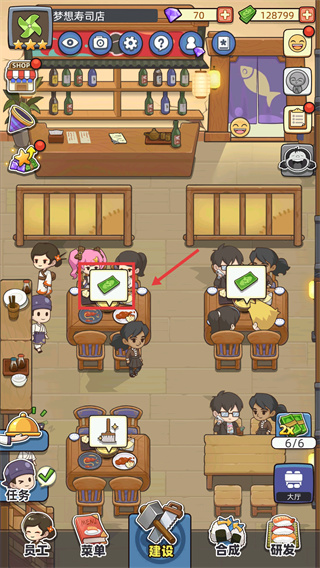 3、在大廳場景,點(diǎn)擊顧客桌前的金幣標(biāo)識,完成訂單結(jié)算,獲取對應(yīng)收益以支持店鋪升級與運(yùn)營。