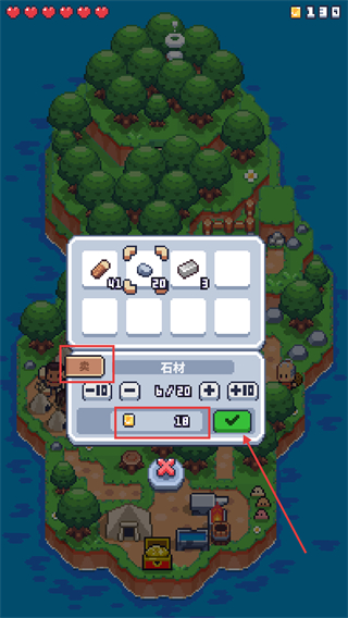 1、打開(kāi)物品面板選中【石材】,點(diǎn)擊【賣】消耗【6石材】獲得【18金幣】,點(diǎn)擊對(duì)勾完成交易積累金幣。