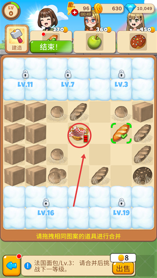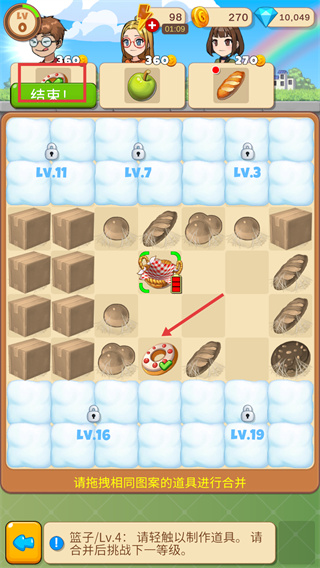 2、合并【法國面包-Lv.3】提升等級,完成后點擊【結束】按鈕,可結算當前階段并解鎖新的物品或功能。
