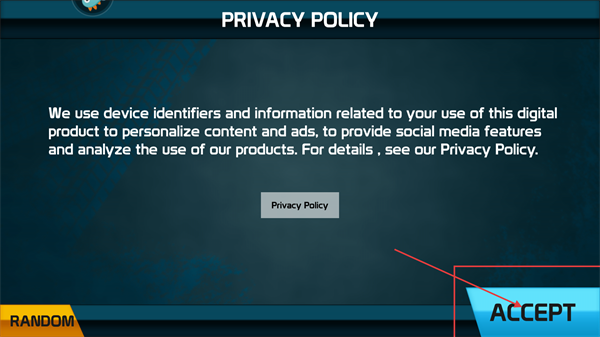 1、進(jìn)入界面后,需先查看【PRIVACYPOLICY】?jī)?nèi)容,點(diǎn)擊【ACCEPT】按鈕同意政策,才能進(jìn)入后續(xù)游戲環(huán)節(jié)。
