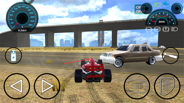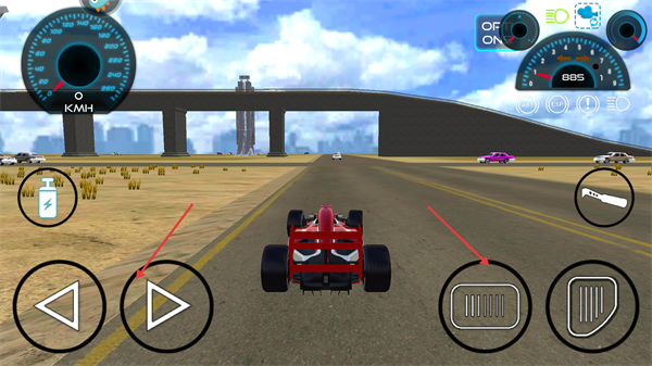 3、游戲中通過方向按鈕操控賽車移動(dòng),界面顯示速度表【KMIH】及數(shù)值【885】,需躲避道路車輛保持行駛。