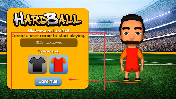 1、進(jìn)入【HARDBALL】界面后,需先在輸入框填寫用戶名,選擇【Choose-a-kit】中的球衣樣式,點(diǎn)擊【Continue】進(jìn)入游戲。
