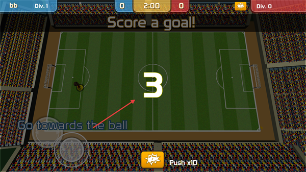 3、比賽中需操控角色向足球移動,界面提示【Go-towards-the-ball】,通過移動按鈕控制角色靠近足球,推進(jìn)進(jìn)攻。