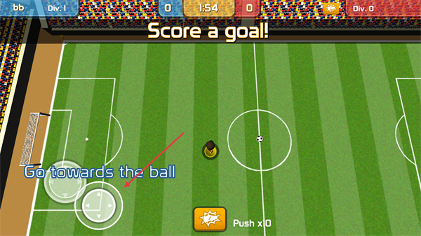 4、操控時(shí)利用方向按鈕調(diào)整角色位置,持續(xù)向足球靠近,同時(shí)關(guān)注倒計(jì)時(shí)【1:54】,盡快完成【Score-a-goal】的目標(biāo)。