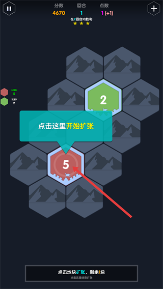 3、在1-1關(guān)卡內(nèi),根據(jù)提示點擊數(shù)字為“5”的地塊,啟動地塊擴張的操作流程。